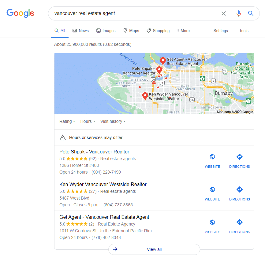 That’s the result I get when I Google “vancouver real estate agent”. Note that I can see reviews, the real estate agent’s address, phone number, hours of operation, and more. You cannot be a part of these results (known as the 3-Pack) without a GMB, and they are some of the most visually compelling search results you can get on Google.