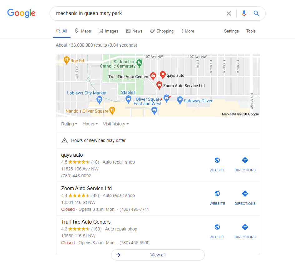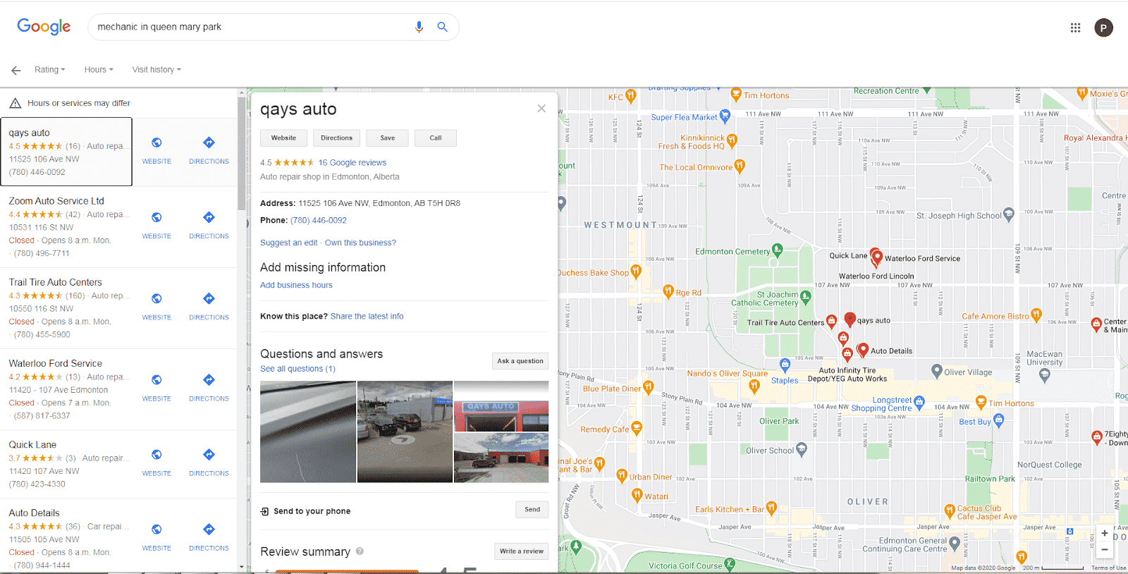 Not sure which category to pick? Look at what other businesses similar to yours in Edmonton are choosing. You can see the category of a business by looking at their GMB listing (the mechanics we found in Queen Mary were all listed as “Auto repair shop”).