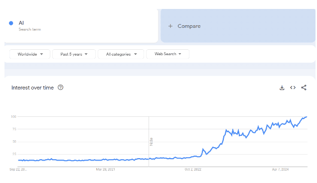 To understand how market trends can affect CPC rates, just look at the massive increase in search volume for the term “AI” over the past 5 years: