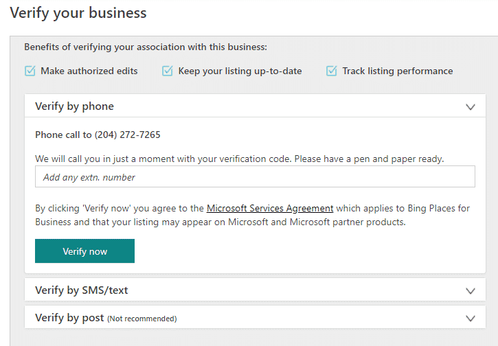 How does Bing know that the person making changes to your listing is really you? After all, you want to be sure that not just anyone can alter your listing. You’ll need to go through an authorization process to verify your business.