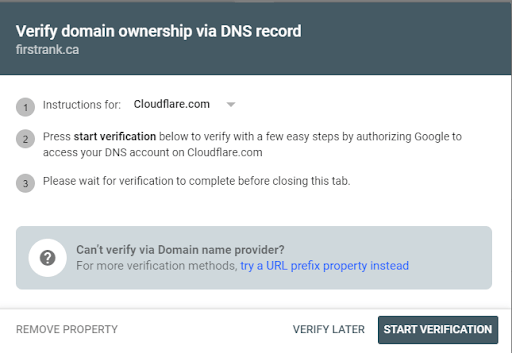 - In this example, we’re verifying our domain—hosted on Cloudflare. Your DNS provider may be different, but you can always follow Google’s verification instructions. No matter which method you use to verify your GSC, we recommend you follow the Google Search Console guide to verify your site ownership.