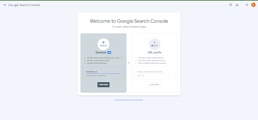 - From here, you’ll be greeted by a page welcoming you to Google Search Console. Simply add the domain you want to manage, then click “Continue”. Note that you’ll generally want to use the domain with or without the “www.” prefix.